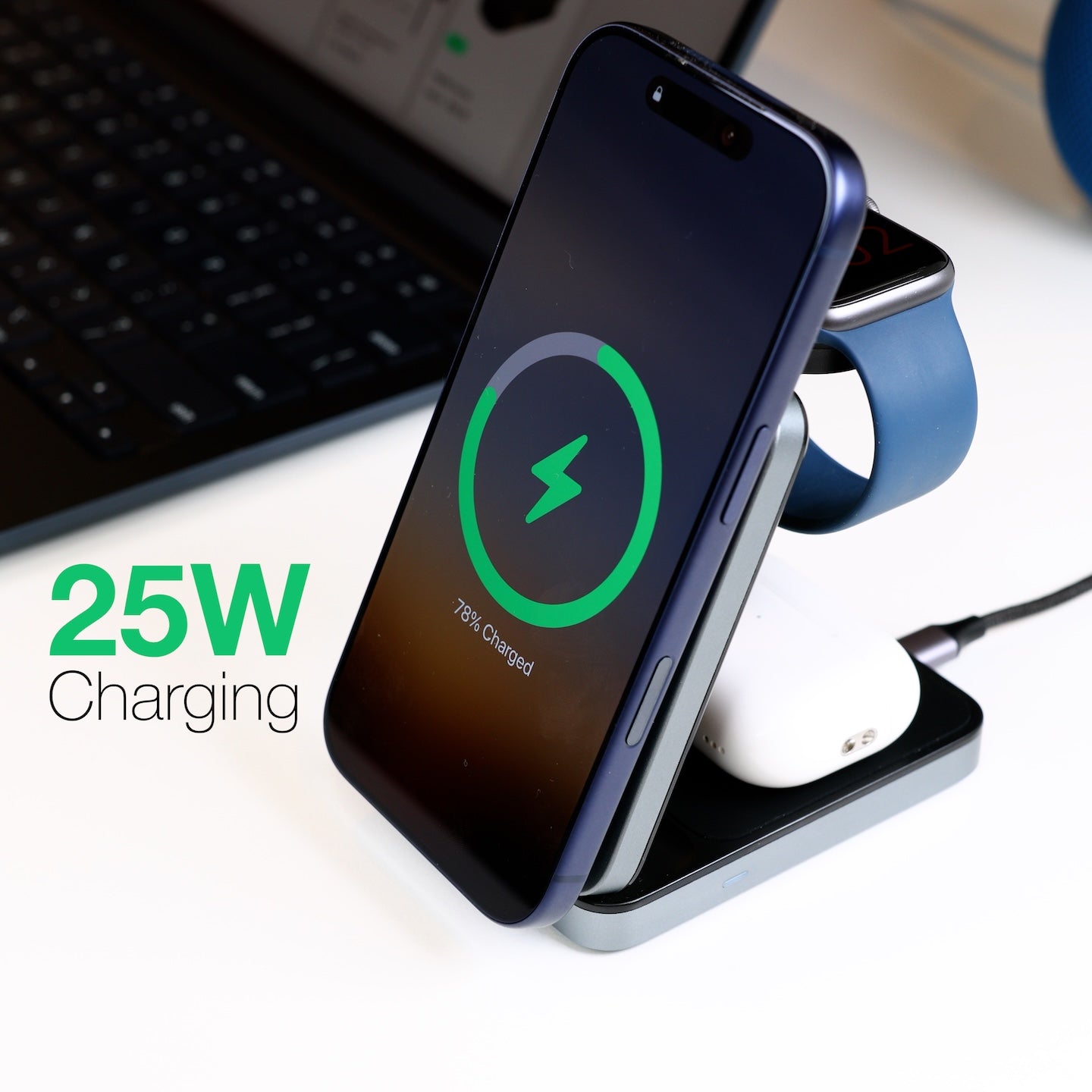 Qi2.2 3-in-1 Wireless Compact Travel Charger for your Phone, Watch, and AirPods/earbuds.